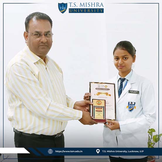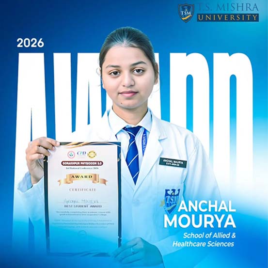 Adding to the pride of the institution, T.S. Mishra University was honored with the “Best College Award” in recognition of its commitment to quality education, research, and community outreach. Ms. Anchal Maurya, DPT II Year, was also conferred the “Best Student Award” for her outstanding academic performance and active participation in professional activities.