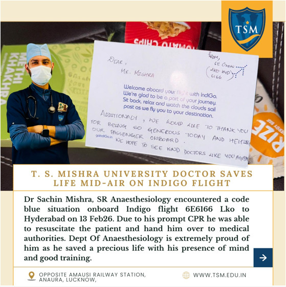 A moment of calm, skill, and responsibility highlights the strength of clinical training at T.S. Mishra University, as Dr. Sachin Mishra, Senior Resident (Anaesthesiology), T.S. Misra Medical College & Hospital, responded to a mid-air medical emergency onboard an IndiGo flight from Lucknow to Hyderabad on 13 February 2026. His timely CPR and presence of mind helped stabilize the patient until medical authorities took over, reflecting professional excellence, preparedness, and the values of patient care upheld within the university’s medical ecosystem.